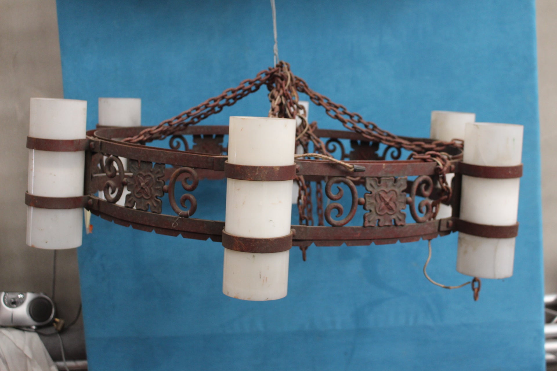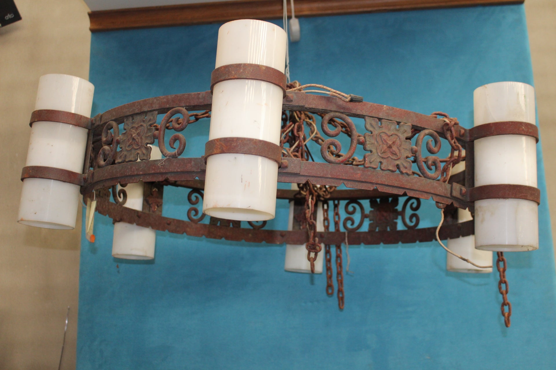 Wrought iron hanging chandelier with opaline glass shades in the gotic style